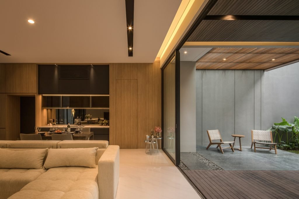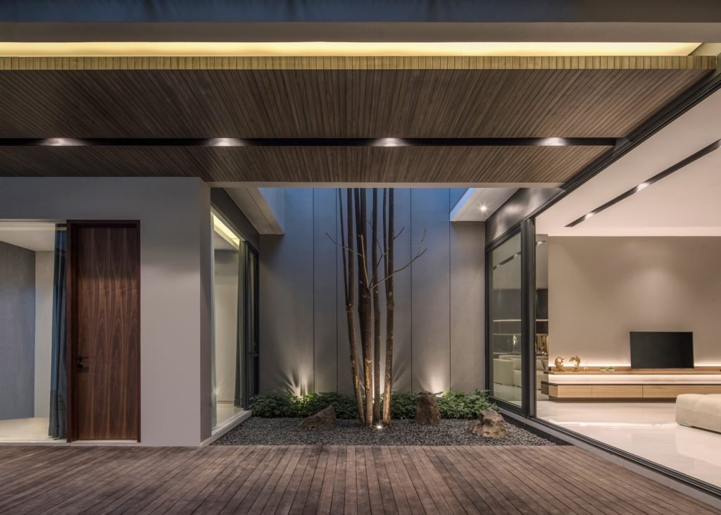 Rumah dua lantai ini memiliki “magnet” tersendiri. Dengan pembagian ruangan yang dibutuhkan oleh pemilik rumah, tim arsitek membagi area/zona yang mengedepankan kenyamanan dan tata letak yang proporsional. Area bawah lebih difokuskan untuk publik seperti area ruang keluarga (living room), dan dining area, serta kamar tamu. Sedangkan di lantai atas lebih ke area private dimana terdapat ruang tidur utama dan ruang tidur anak. Keinginan pemilik untuk dapat menghadirkan area yg lebih terbuka dan kenyamanan, maka tim arsitek mendesain ruang-ruangannya banyak bukaan sehingga rumah terasa lebih sehat dan lebih “bernafas” serta menghadirkan tiga jenis taman yaitu ada taman hijau, taman semi kering dan taman kering yang terdapat di bagian belakang rumah. Ketiga jenis taman tersebut merupakan point of interest pada bangunan hunian ini.