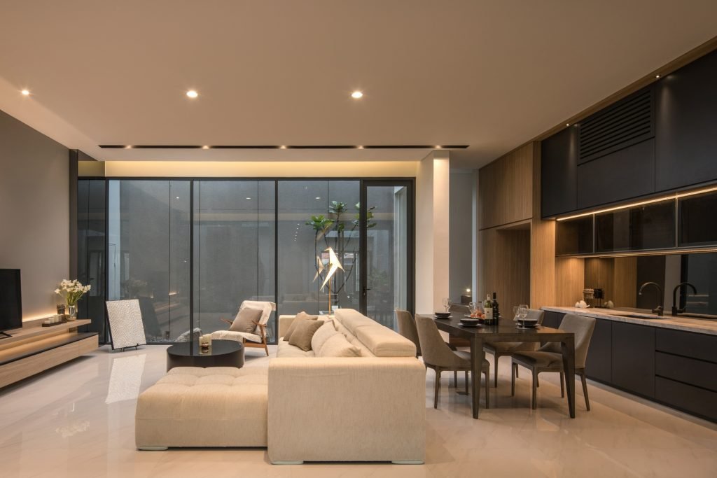 Agar selaras dengan konsep arsitekturnya, tim arsitek menata interior pun senada yaitu lebih simple modern dengan permainan warna yang lebih ke earth tone, ditambah dengan permainan lighting yang pas sehingga ambiance terasa lebih cozy. Tentunya pemilihan perangkat furniture dan elemen dekorasi interior pun harus sesuai dengan konsepnya sehingga suasana yang ingin dihadirkan dapat terwujud. Untuk itulah, tim arsitek menempatkan sofa type Aztec di living room, serta meja makan & kursi makan type Costa yang difinishing warna coklat abu di dining room, dari @vinotiliving merupakan pilihan yang tepat karena dari desain serta warna sangat menunjang konsep yang diterapkan sehingga secara keseluruhan di area ini mampu menghadirkan suasana yang lebih rileks.