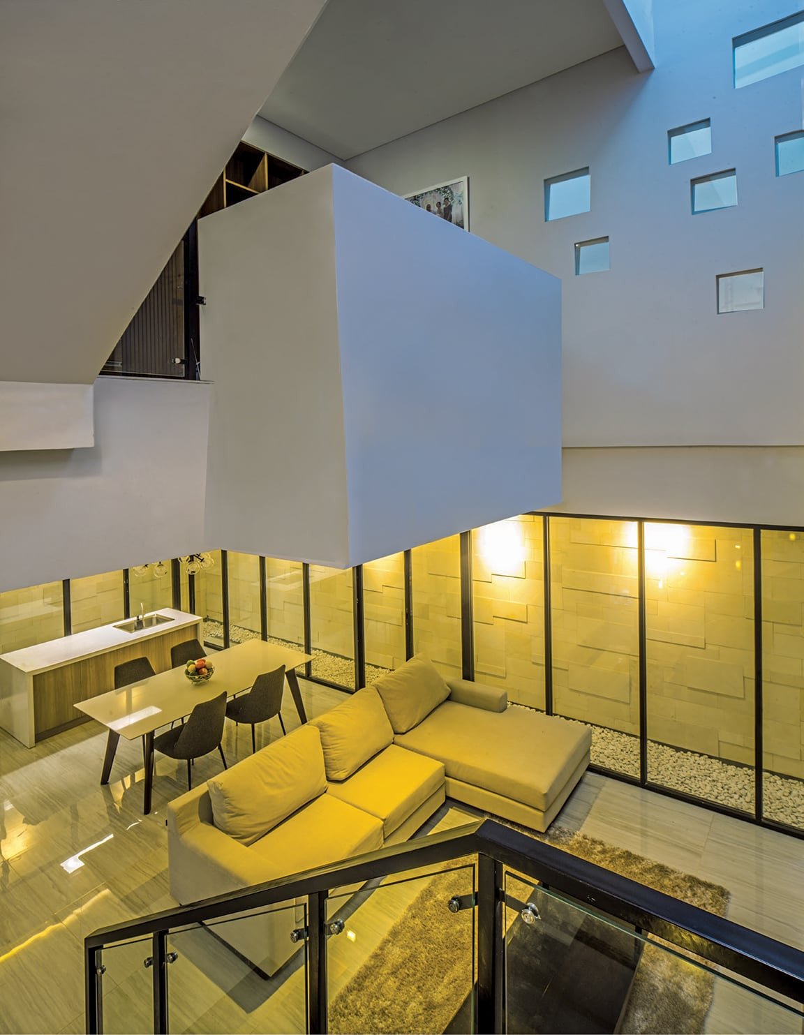 Dinding bagian muka dibuat tidak full. terdapat celah 60cm, dibuat bercelah agar cahaya matahari dapat masuk ke area ruang keluarga, membentuk ambiance ruang yang nyaman dengan pencahayaan alami. Ruang keluarga dan ruang makan dijadikan satu untuk memberikan kesan luas dan moderen. Sementara partisi kaca yang dapat dibuka dipasang sebagai pembatas ke taman di halaman belakang untuk memaksimalkan cahaya dan penghawaan alami ke ruang dalam bangunan. Dengan demikian, rumah ini seakan terdiri dari beberapa bagian yang dibedakan dalam bentuk berlainan, memberikan penyelesaian yang seimbang.
