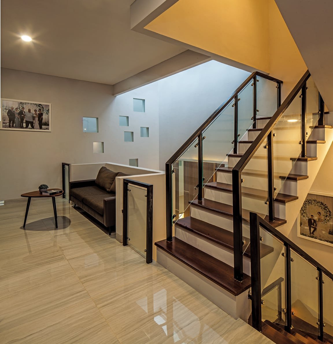 Di samping ruang tamu terdapat ruang tidur tamu yang cukup privat. Kemudian masuk ke area ruang keluarga yang terlihat menyatu dengan dapur bersih, ruang makan dan ruang keluarga tanpa diberi penyekat. Pada area ruang keluarga dilengkapi sofa yang lebih santai dan seperangkat audio visual. Ruangan ini menjadi ruang favorit tempat penghuni berkumpul untuk kegiatan keluarga sehari-hari. Dari ruang keluarga dihubungkan dengan kegiatan yang lebih privat di lantai atas, dengan menggunakan tangga yang berukuran cukup lega dan nyaman digunakan. Pada bagian bordes tangga