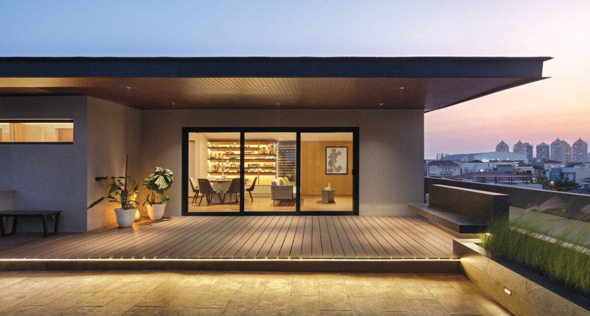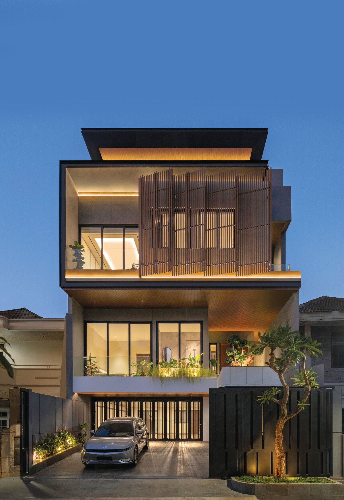 Indonesia yang beriklim tropis kaya akan sinar matahari dan curah hujan yang tinggi, harus disikapi dengan baik dan benar oleh seorang arsitek ketika merancang sebuah hunian. Demikian halnya dengan hasil rancangan Yuanda Saputra dari Escala Studio, sebuah hunian berlantai 3,5 lantai yang berada di atas lahan seluas 220 m2 ini didesain dengan mengadop gaya arsitektur modern tropis yang disesuaikan dengan iklim tropis dengan memperhatikan pencahayaan dan pengudaraan alami dalam bangunan serta eksplorasi material yang ramah lingkungan. Konsep ini diajukan oleh tim arsiek sejak awal sebagai respon atas keinginan pemilik yang menginginkan rumahnya berkesan hangat, homey, dan memaksimalkan cahaya dan udara yang alami.