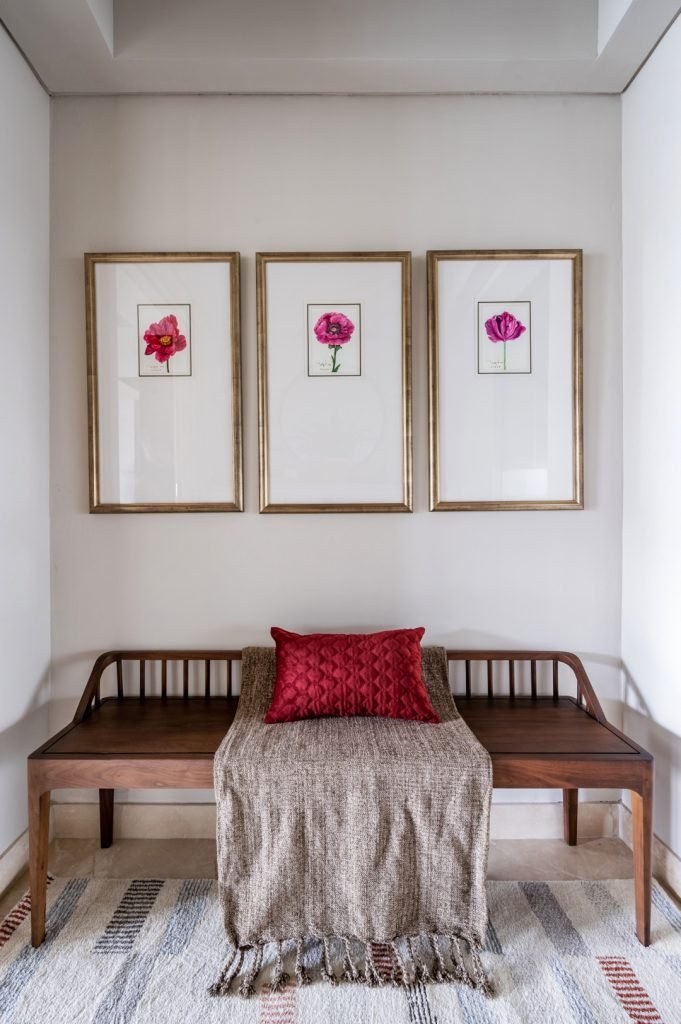Untuk mengurangi kesan datar, desainer menerapkan warna lain sebagai bagian dari aksen ruang. Warna biru artwork untuk ruang makan dan merah untuk foyer diaplikasikan pada bagian aksesori interior. Bantal hias dan foto print yang dipadukan dengan furniture seperti “amben” kecil yg didesain simpel mampu menghadirkan nuansa “Chic” pada foyer.