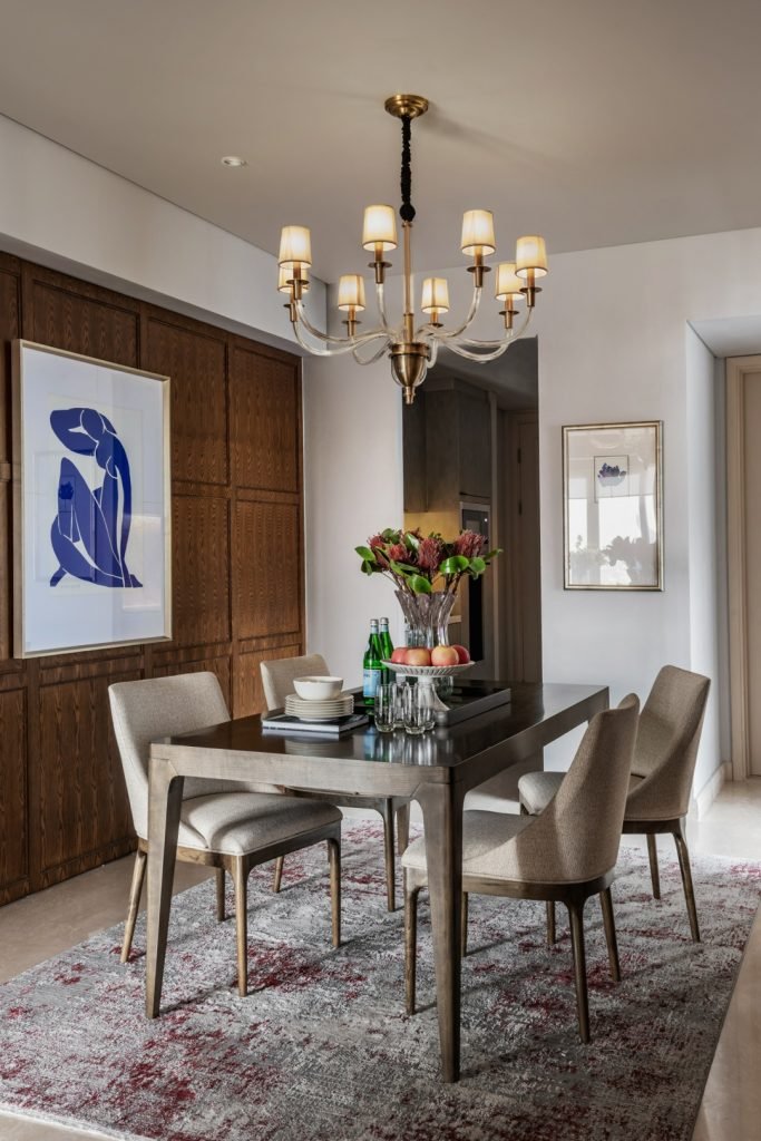 Desainer Hidajat Endramukti berhasil memadukan tuntutan akan fungsi dan kebutuhan ruang serta unsur estetis yang diterjemahkan ke dalam gaya interior modern di sebuah unit apartemen yang terletak di Surabaya. Living room ditata dengan menerapkan warna abu dan biru sehingga suasana hangat tercipta di area ini terutama dengan hadirnya wood panel (white oak) pada salah satu bidang dindingnya. Pemilihan dan penempatan aksesori interior seperti lukisan, bingkai foto serta ornamen lainnya disesuaikan dengan suasana yang ingin dihadirkan pada ruang tersebut.