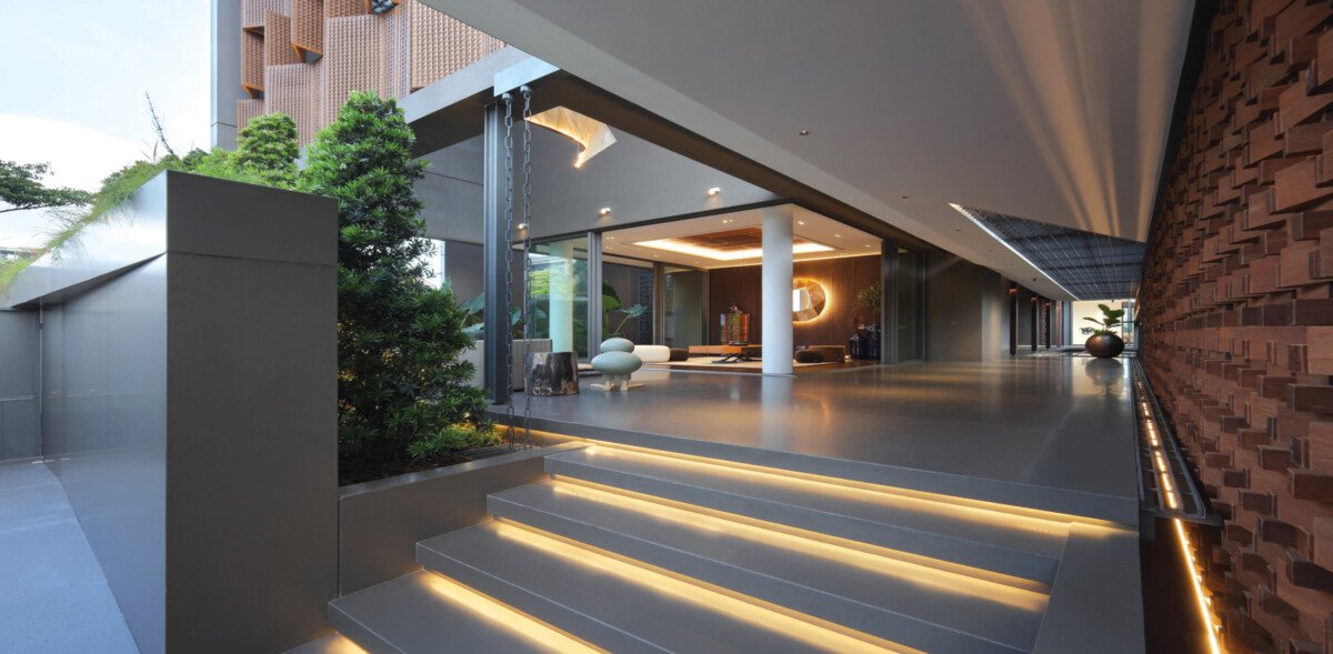 Detail-detail arsitektur dengan permainan screen motif pada bagian langit-langit dan fasad diperkuat dengan bidang-bidang finishing interior yang flat dan clean sehingga bisa menciptakan shading dan shadow nuansa interior yang berbeda tiap waktu, yang menambah kesan mewah.