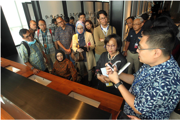Marketing Manager TOTO Indonesia, Antonius Rudianto (paling kanan), didampingi oleh Ketua Asosiasi Toilet Indonesia, Naning Adiwoso (kedua dari kanan), tengah menjelaskan tentang contoh-contoh toilet yang higienis dan ideal bagi penyandang disabilitas di showroom TOTO.