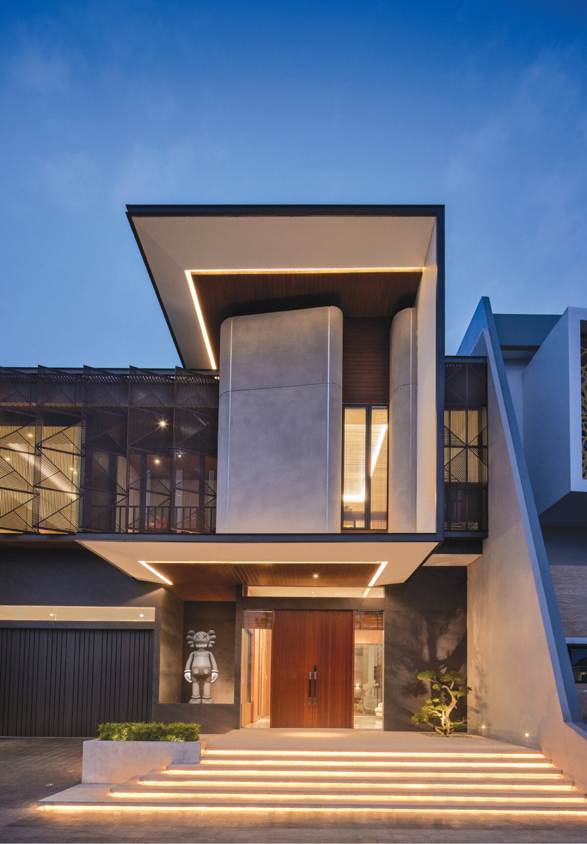 Dalam hal ini tim desain juga berkolaborasi dengan ahli fengshui yang dipercaya oleh pemilik rumah, dan setelah melalui proses diskusi, maka ada kesepakatan bahwa massa bangunan di bagian kiri harus lebih tinggi dari massa bangunan bagian kanan. Berangkat dari hal tersebut, timbul ide untuk membuat aksen utama barupa frame yang juga berfungsi sebagai kanopi bangunan dengan tambahan geometri melengkung sebagai pemanis fasad agar tidak terkesan kaku. Massa bagian kanan diberi secondary skin sebagai buffer terhadap jalan masuk dan sebagai penyaring panas dari cahaya matahari pada ruangan kamar di belakangnya. Sedangkan fasad belakang diolah menyesuaikan dengan fasad depan dengan bukaan yang lebih besar untuk memaksimalkan kondisi site dengan view yang bagus.
