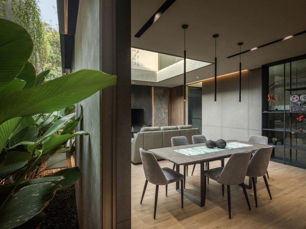Konsep warna interior dipilih bernuansa natural dengan palet monokrom. Furniture dibuat kustom sesuai dengan kebutuhan penghuni, terbuat dari kayu maupun metal seperti terlihat pada meja dan kursi makan yang walaupun berada di tengah ruangan namun terkesan lega. Ruang duduk terletak di bagian agak belakang dengan sofa menghadap ke dinding dimana juga terletak TV. Sofa dengan dudukan dan bantalan tebal memang diperlukan untuk kenyamanan duduk santai, oleh karena itu diletakkan di bagian belakang ruangan.
