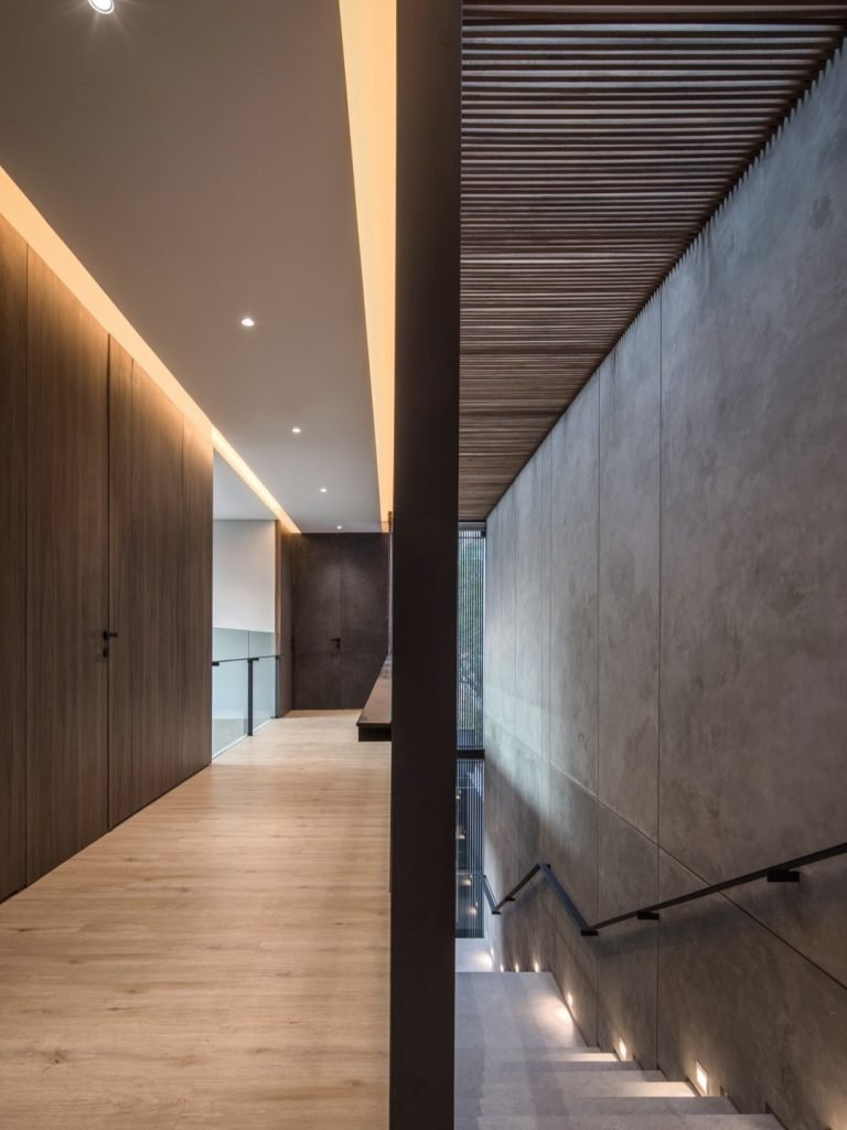 Rumah yang terletak di Bandung ini diarsiteki oleh Ruang Rona untuk kliennya, sebuah keluarga muda dengan dua anak balita. Bentuk site memanjang sehingga arsitek harus memaksimalkan pembagian ruang dengan membuat courtyard di bagian sisi bangunan agar terjadi pergerakan udara di seluruh bagian bangunan.
