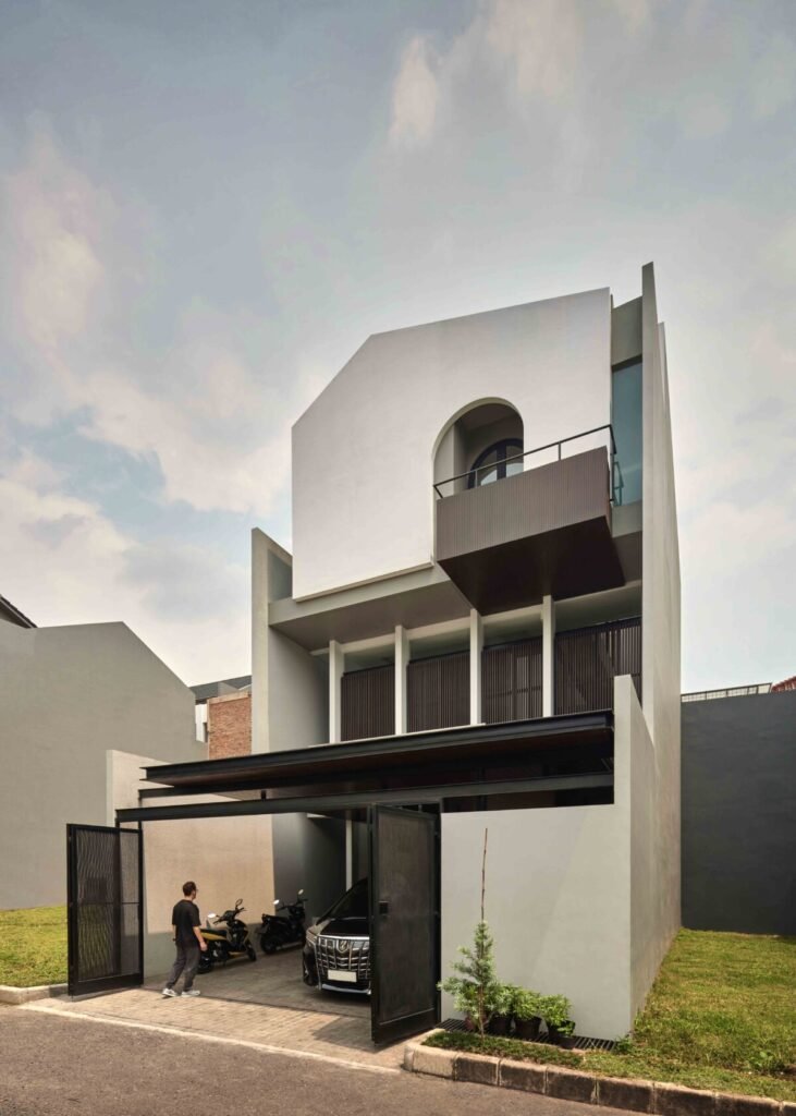 Void yang mengelilingi bangunan diolah bukan sekadar jeda, tetapi sebagai saluran cahaya dan udara, menjawab tantangan site yang terbatas agar tetap mendapatkan pencahayaan dan sirkulasi udara alami secara maksimal. Selain itu, kisi-kisi kayu Conwood tampil di depan rumah, ia bukan hanya pelindung privasi, melainkan juga bingkai bagi cahaya yang masuk, membuka dialog visual antara rumah dan lingkungannya.