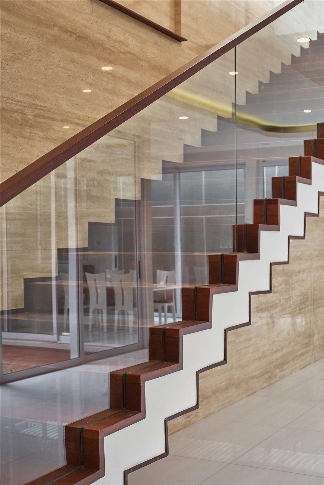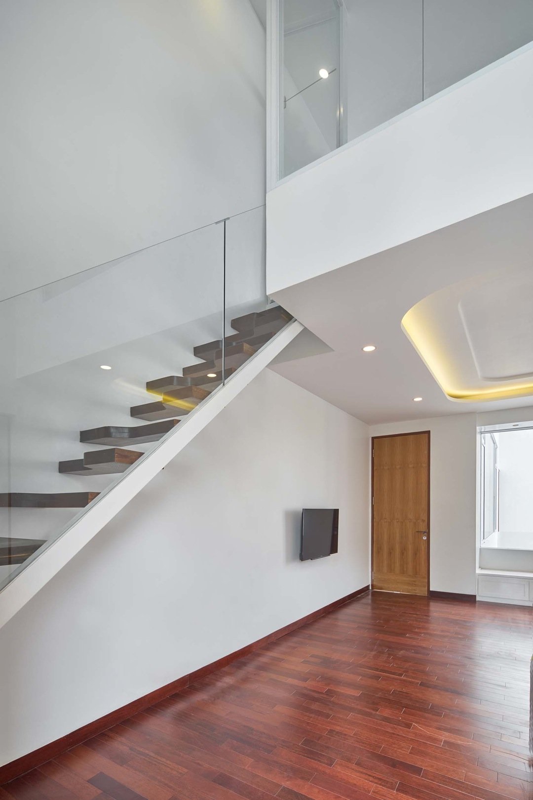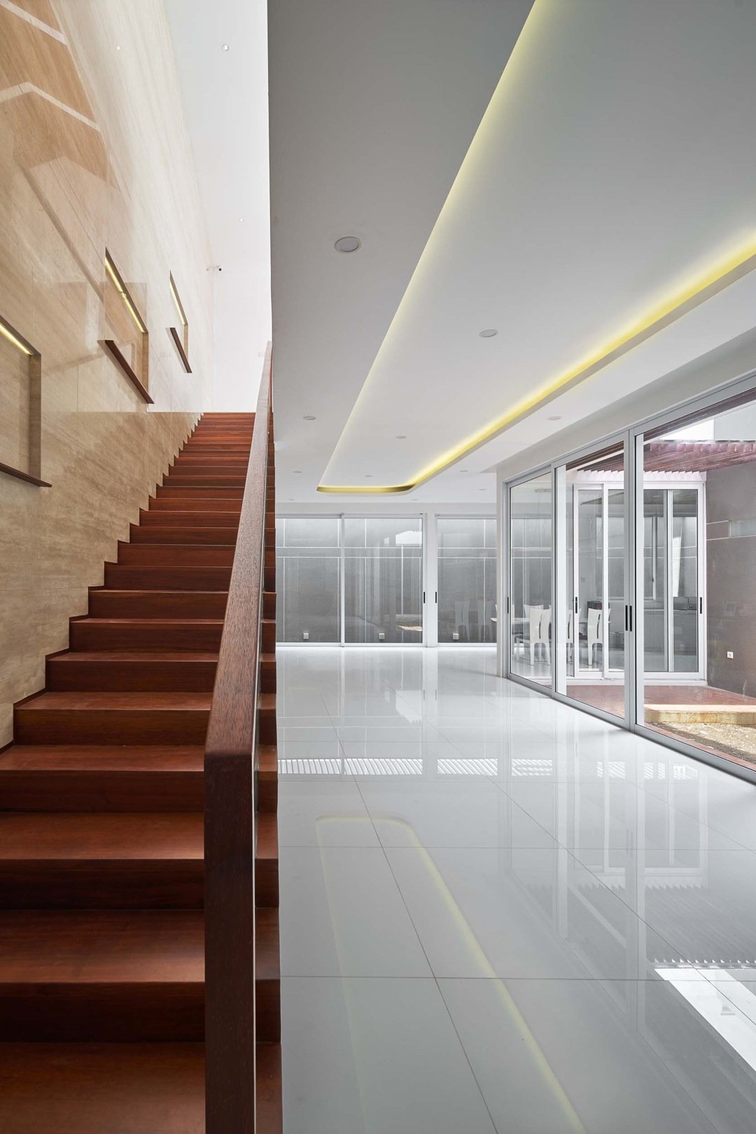 Hal tersebut kami siasati dengan pemisahan bangunan utama dan bangunan service dengan split level. Bertujuan supaya setiap lantai dan ruangan boleh mendapatkan bukaan dan view yang maksimal.
