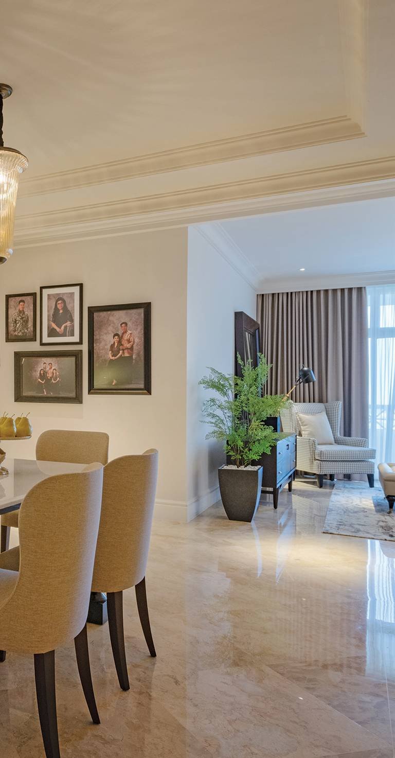Meskipun berada di dalam bangunan apartemen, namun oleh desainer interiornya dirancang homey layaknya di sebuah rumah tinggal. Melalui pemilihan furnitur bergaya “Semi Colonial” yang diterapkan pada penataan interior bernuansa modern, apartemen ini mampu menampilkan kesan elegan didominasi warna netral dan monochrome.