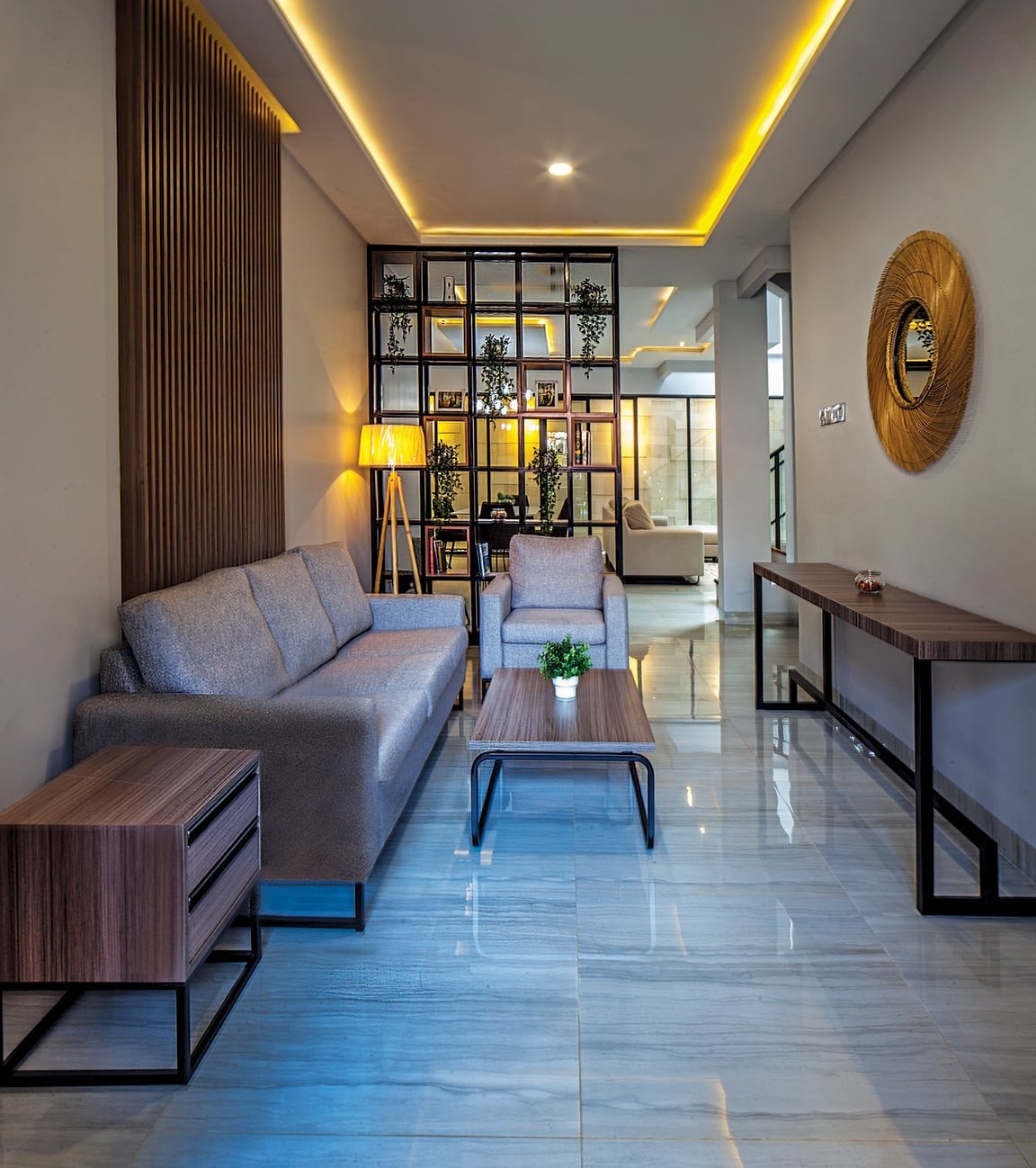 Lantai rumah menggunakan marmer untuk ruang kegiatan umum, dan lantai parket pada ruang privacy. Ruang tamunya dirancang bernuansa putih sehingga terlihat lega dengan sofa dan meja konsol berwarna abu-abu yang di atasnya dipasang aksesori berupa cermin berbentuk bundar. Pada ruang ini ditempatkan penyekat kayu yang berfungsi juga sebagai tempat meletakkan berbagai aksesori.