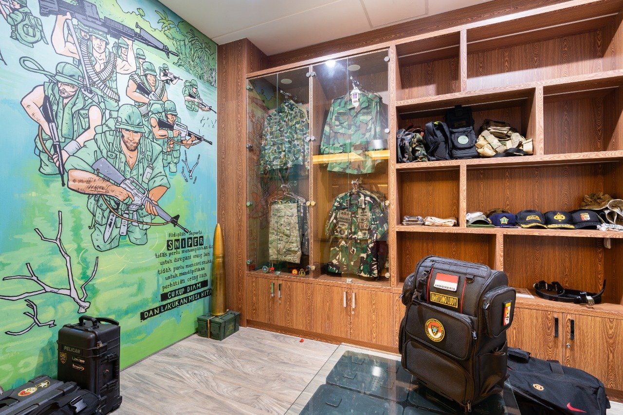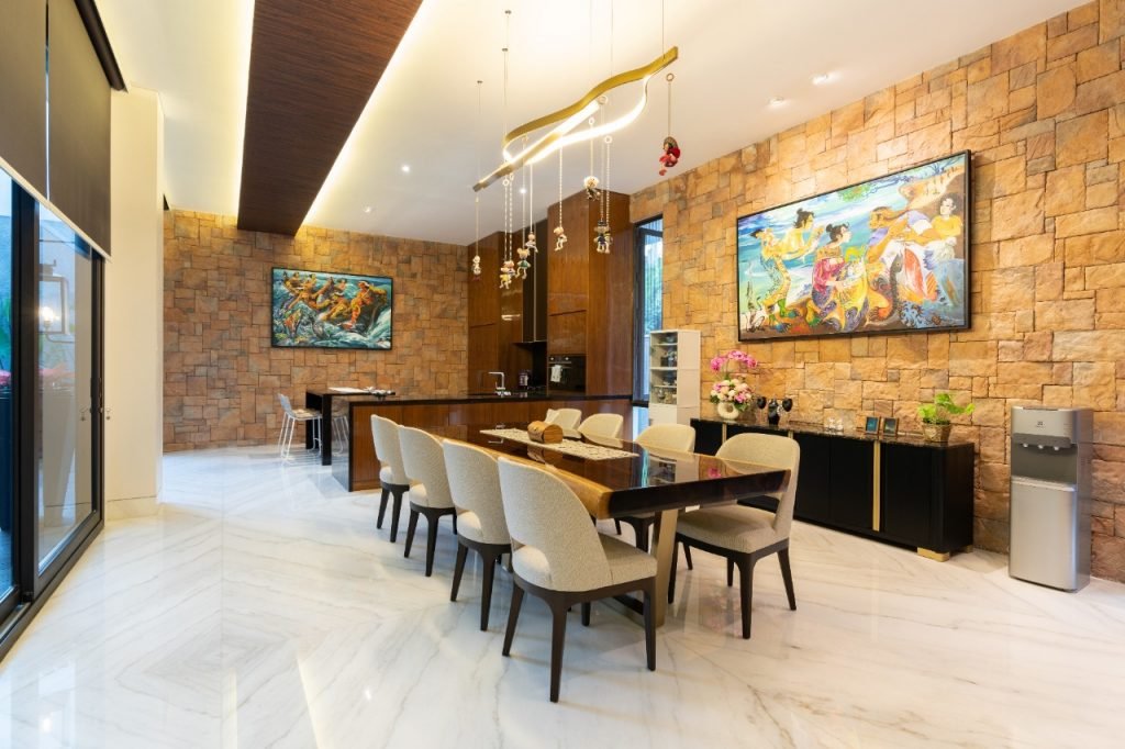 Bangunan seluas 1500m2 dengan lahan seluas 1340m2 ini terdiri dari tiga lantai. Lantai dasar berupa ruang semi basement yang diperuntukkan untuk garasi, ruang hobi, kegiatan gym, homecafe, ruang musik dan ruang servis. Lantai 1 terdapat ruang tamu, keluarga, ruang makan, pantry, ruang-ruang tidur, galeri dan kolam renang. Lantai 2 adalah ruang-ruang privat seperti ruang tidur utama, ruang tidur anak dan ruang doa. Semua kebutuhan ruang tersebut menjawab respon keinginan pemilik yg meliputi hobi, serta karakteristiknya. Maka arsitek menerapkan konsep hunian yang dirancangnya sesuai dengan iklim tropis yang diberi sentuhan modern. Kepiawaian arsitek Egino salah satunya adalah gemar berksplorasi dengan ruang dan ini berhasil diwujudkan pada rancangan hunian ini.