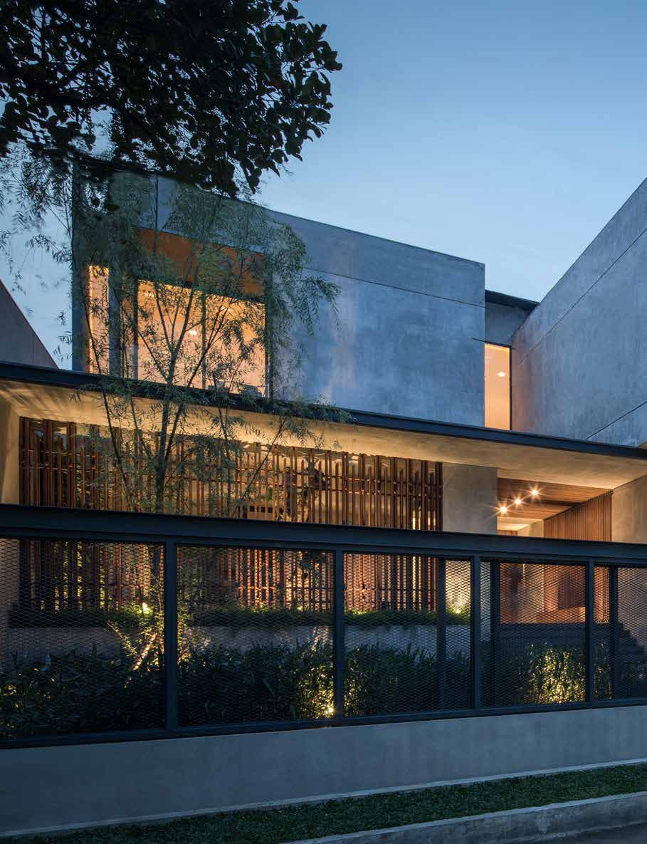 Bangunannya seluas 650 m2 berupa satu massa yang tak terpisah, oleh sang arsitek dibuat konstruksi leveling agar terjadi terkesan seolah ada permainan pada bentuk dan fasad bangunannya. Keberadaan kisi-kisi kayu pada area depan untuk “memperlunak” fasad sekaligus berfungsi sebagai penyekat antara halaman depan dengan area di dalam rumah. Area eksterior ini dipercantik dengan hadirnya unsur hijau dari tanaman di halaman depan mempercantik entrance.