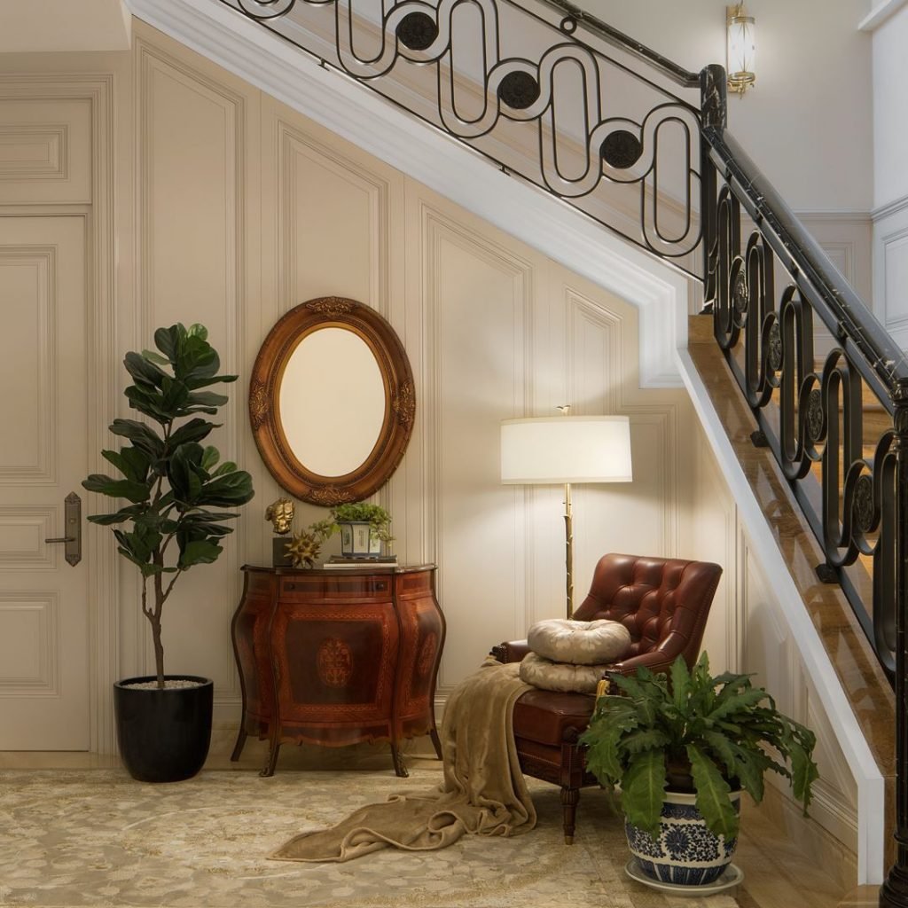 Grandeur & Extravagance adalah kata2 yang tepat dalam menggambarkan interior rumah mewah bergaya klasik ini. Foyer dan koridor berhias chandelier merupakan focal point tersendiri ketika kaki melangkah. Tangga dengan railing besi tempa seakan menjadi suatu sculpture, dengan bawah tangga diisi lemari dan mirror sebagai aksen dan satu lounge chair beserta lampu bacanya. Ruang keluarga terasa lega dengan sofa extra besar terletak berdampingan dengan ruang makan berisi furniture dari DaVinci bergaya klasik yang menguatkan kesan classic luxury secara utuh. Dapur ada di sebelah ruang makan, terlihat rapih dengan deretan lemari besar dan island di tengahnya berlapis marmer. Dapur modern ini memenuhi segala fungsi yang diimpikan nyonya rumah, dengan tetap menampilkan kemewahan dan style.