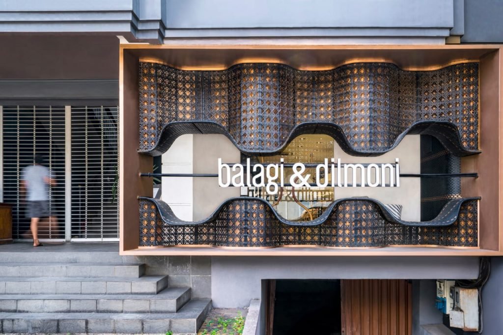 Dengan pendekatan ekstrim, WAR Architect mendesain fasad bangunan toko Balagi&Dilmoni memakai anyaman rotan yang didesain artistik ‘bergelombang’, untuk memberi kesan yang maksimal sebagai pembuat furnitur rotan yang handal. Anyaman rotannya terdiri dari beberapa pattern, yang menarik adalah pada sisi vertikal yang terdiri dari dua anyaman ‘open weave’ untuk dapat memunculkan kesan ‘depth’ pada fasad bangunan dengan memakai warna hitam dan brass.