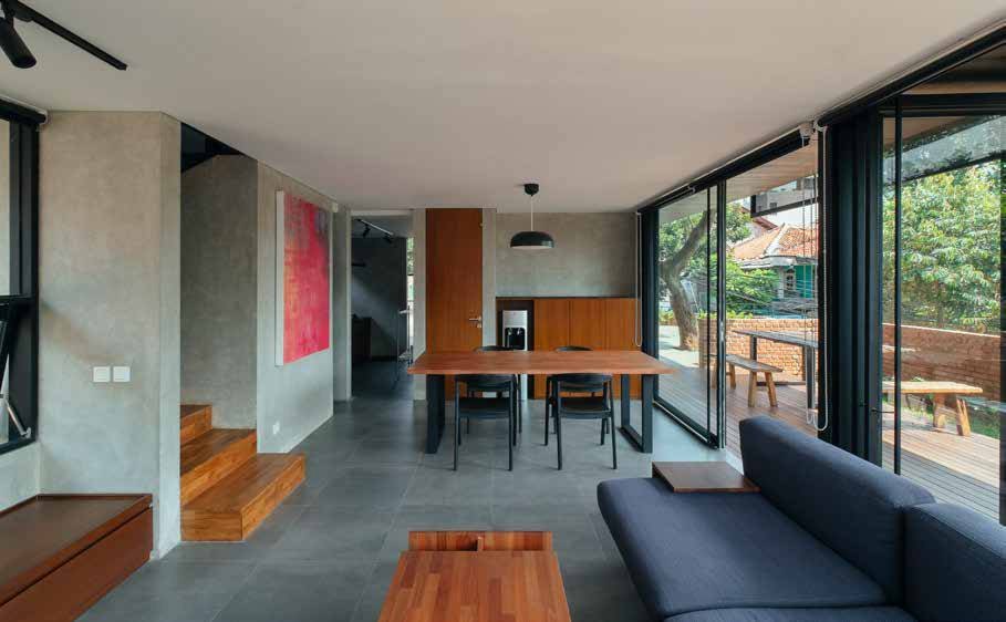 Interior dirancang sesuai dengan kebutuhan dan dipilih furniture yang ringan, misalnya menggunakan material kayu, atau furniture custom agar sesuai dengan ukuran ruang dan kebutuhan pemilik. Penerapan warna pun sangat monochrome dan natural, aksen warna lain didapat dari elemen dekorasi seperti lukisan atau bantal kursi.