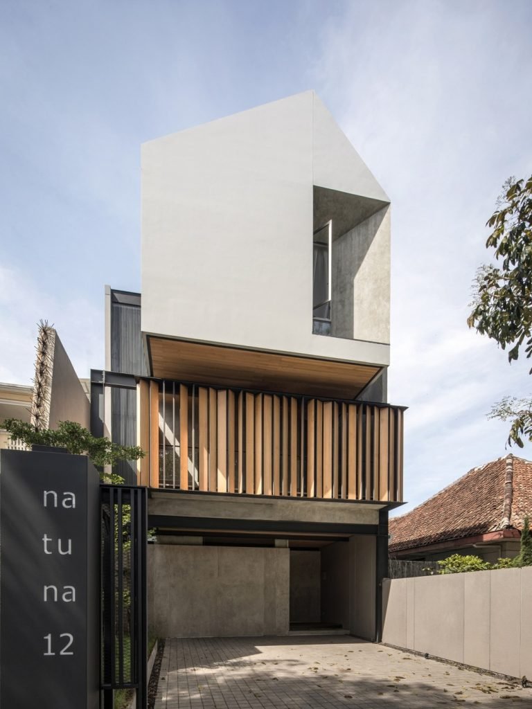 Rumah yang terletak di Bandung ini diarsiteki oleh Ruang Rona untuk kliennya, sebuah keluarga muda dengan dua anak balita. Bentuk site memanjang sehingga arsitek harus memaksimalkan pembagian ruang dengan membuat courtyard di bagian sisi bangunan agar terjadi pergerakan udara di seluruh bagian bangunan.